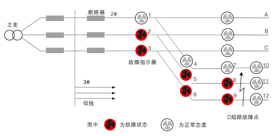 當(dāng)線路發(fā)生短路或接地故障后,故障電流流經(jīng)線路上安裝的故障指示器均翻牌或閃光指示,而非故障線路,非故障分支和故障點(diǎn)后的故障指示器不動作。運(yùn)行人員從變電站出發(fā),沿著故障線路查看故障指示器動作情況,確定故障范圍在最后一只動作的故障指示器和后段第一只未動作的故障指示器構(gòu)成的區(qū)間,從而迅速確定故障區(qū)段,分支及故障點(diǎn)。帶通信功能的遠(yuǎn)傳型故障指示器,不再需要去現(xiàn)場巡線查找故障,故障指示器與通信終端.后臺軟件配合,在3-5分鐘在監(jiān)控主站或者手機(jī)上即可收到故障信息,確定故障區(qū)段。