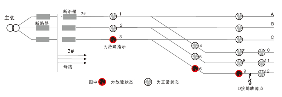 由2#線C相3、6、9指示器白天翻紅牌顯示,而12指示器仍為白色即可判斷出D點(diǎn)發(fā)生接地故障。